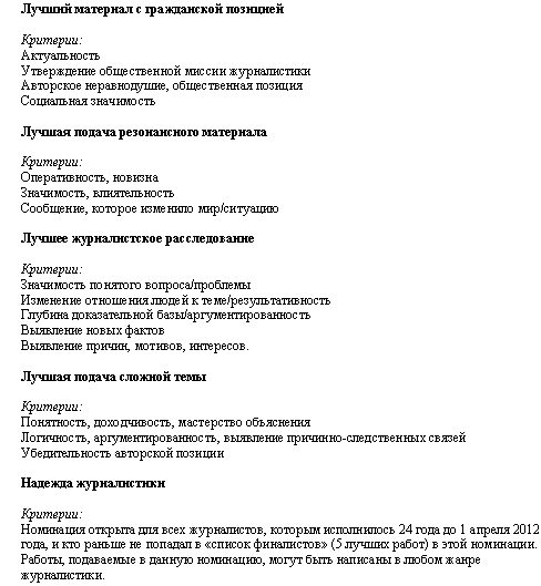 Прием работ на конкурс «Честь Профессии 2012» продолжается, конечная дата подачи работ – 1 апреля 2012 года. Материалы могут быть поданы как непосредственно журналистом, так и редакцией либо третьим лицом (например, читателем, считающим ту или иную работу достойной награды в конкурсе).