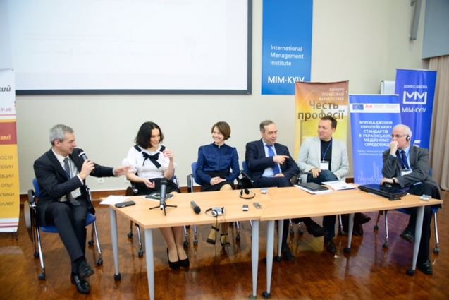 Вопрос качественной журналистики и соблюдения стандартов во время кризиса перед участниками конференции обсуждали директор Сети этической журналистики и бывший редактор The Guardian Эйден Уайт, шеф-редактор ТСН Татьяна Пушнова, директор телеканала "24" Роман Андрейко, гендиректор "Интерфакс-Украина" Александр Мартыненко и шеф-редактор lb.ua Соня Кошкина.