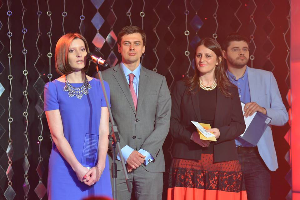 Роман Кравець, Оксана Хомей, Андрій Пасічник та Валерія Лопатіна, учасники школи журналістики УП, з роботою «Виросли на майдані. Волонтерські ініціативи два роки тому».